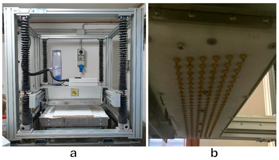 The 3D printer used in the current research was developed by Desamanera (Rovigo, Italy), and is capable of producing large-sized pieces, up to a maximum of 600 × 600 × 600 mm3, with a cubic voxel resolution of 3.0 × 3.0 × 3.0 mm3. A recoating system is used to generate the powder bed, which is deposited in the x–y plane. A specific volume of the required layer (50% volume, i.e., half a layer with a thickness of 1.5 mm) is deposited while the printer head moves forward. In the meantime, the printer head sprays liquid (the binder) onto selected areas of the powder bed layer, based on the printed part’s designed geometry, through all or some of the 192 nozzles in it, which have an internal diameter of 1.1 mm (see Figure 1). Subsequently, the printer head moves backward (after being raised in the z direction), and the recoating system finally deposits the remaining powder to create a total layer thickness of 3 mm. This process is repeated layer by layer until the printing process is complete. The printer components were specifically designed by Desamanera to work with inorganic binders such as water and alkaline solutions with high pHs and viscosities greater than water.