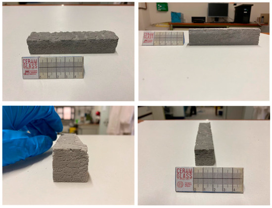 The overall morphology of the printed bar (135 × 30 × 30 mm3) is shown in Figure 5. The figure presents the top and side views of the printed bar from different directions after cleaning unreacted glass particles following extraction from the powder bed, as well as images of the cut surfaces. These surfaces reveal a strong interface between the printed layers, confirming the formation of a geopolymer-like gel during consolidation.