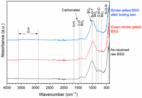 FT-IR spectrum of the as-received, green binder-jetted, and post-boiling borosilicate glass.