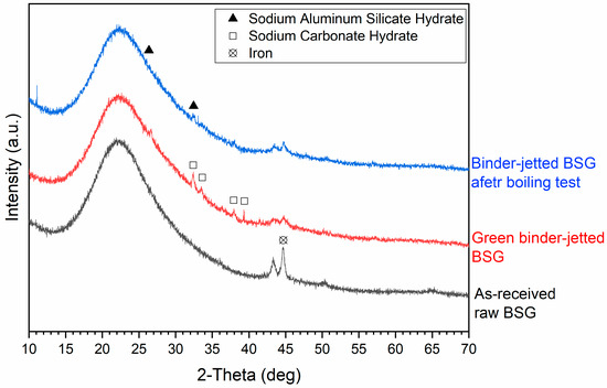 X-ray diffraction patterns of the as-received, green binder-jetted, and post-boiling borosilicate glass.