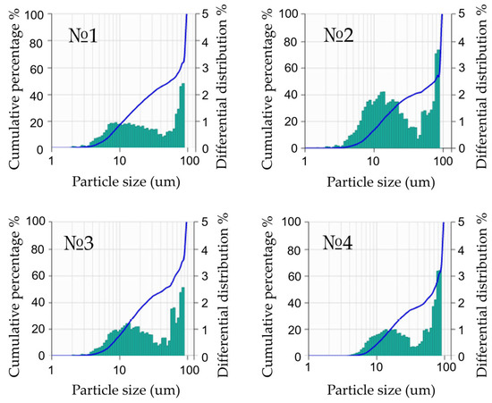 To determine the effect of the fractional composition on the porosity of graphite matrices after carbonization, several types of samples were produced which were different in the quantitative composition of fractions. Because sieving, the initial stage of fractionating graphite powder according to particle sizes, gives only a range of values, we used the laser diffraction method using the Bettersizer S3 Plus (Bettersize Instruments Ltd., Dandong, China) particle size analyzer to determine the exact fractional composition of powders. The data are shown in Figure 3.
