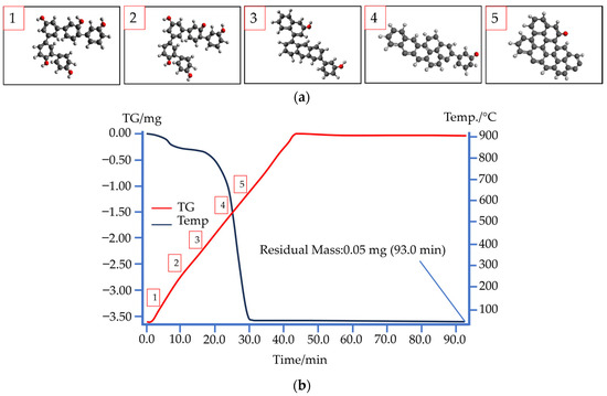 Structural changes in phenolic resin exposed to temperatures: (a) phenolic resin structure changing: (1) initial state, after curing; (2) dehydration begins; (3) carbonization begins; (4) carbonization continues; (5) phenolic resin carbonization near complete; (b) a TG curve for phenolic resin in oxygen.