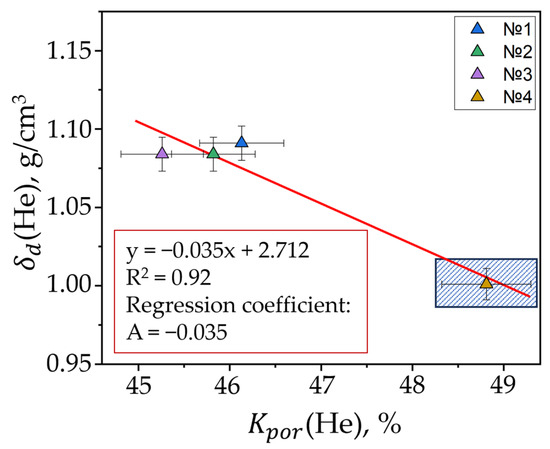 The highest volumetric porosity was recorded in Samples 1 and 4, i.e., when fractions in the composition are uniform and fine graphite fraction prevails (Figure 10). Densities by helium were practically equivalent to those obtained through measuring geometric dimensions and masses.