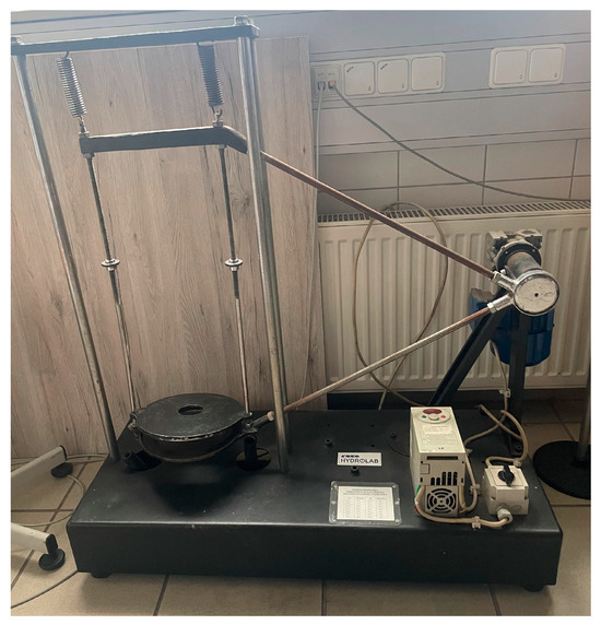 Research activities began with the preparation of intermediate products in a restful atmosphere. Steps were taken to pretreat pine wood and hemp shive. Shredding of the lignocellulosic material intended for compaction was a prelude to the controlled process. It was carried out in the laboratory using a shredder. The shredded lignocellulosic materials were sorted into fraction sizes before being prepared into a biocomposite. An orbital shaker from CBKO Hydrolab (Warsaw, Poland) was used to achieve the desired effect. Guided by ISO 17827-2:2016, the sieve separator divided the material into fractions according to the Polish standard. To achieve this, C.B. KO Hydrolab’s rotary shakers were employed, which enabled precise separation of the material in metal containers equipped with sieves of various mesh sizes [33]. The diameter of the shredded material, in each case, was necessary due to the technical possibilities of the test. The material was prepared to design a specially prepared compaction head with a piston. The machine that performs the screening process along with the established screens is presented in Figure 2.