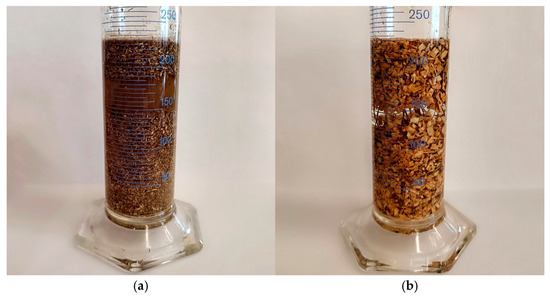 Specific density measuring station: (a) distilled water with pine fraction 0 ÷ 1 mm and (b) distilled water with pine fraction 1 ÷ 4 mm.