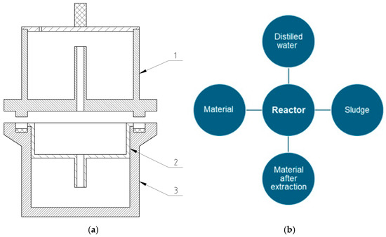 Hot water extraction: (a) set 1—container for extraction solution—reactor lid, 2 for chips, and 3 for reactor body, and (b) schematic of the HWE process layout.