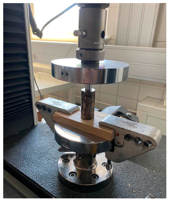 The laboratory process of preparing biocomposite materials requires precision and care. Shaking machines are used to separate hemp shives into fractions based on carefully selected screens. The next step is to thoroughly mix the two materials in appropriate proportions, which ensures even distribution of the components and, ultimately, the homogeneity of the composite. The thermoplastic ABS is heated to the appropriate plasticity in the next phase, facilitating the forming process. To ensure uniformity and density of the composite, the laboratory material is compacted in a testing machine using a specially designed compaction sleeve. Compression is followed by the sleeve’s tempering and cooling, stabilizing the material’s structure and properties. Technically advanced and precise, this process produces biocomposite properties that match expectations. Plasticized granulates play an important bonding role by replacing traditional adhesives, affecting the final product’s strength and durability. The present study implemented a model of a compaction head and connected it to a stress-testing machine. Compaction processes were carried out in the laboratory using a compaction head. Material parameters such as moisture content, granulometric composition, and process temperature had to be considered during the process. The compaction head was heated first in the test to ensure consistent temperature conditions throughout the experiment. The heating step was essential to simulate natural conditions accurately and achieve reliable results. The specially prepared compacting head is presented in Figure 7.