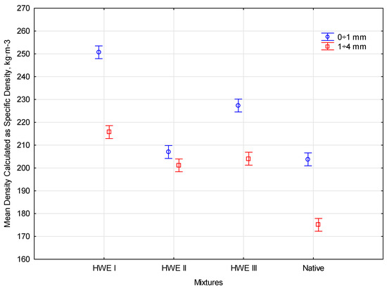 Analyzing the density of comminuted wood material is crucial in biocomposite production since it impacts the product’s mechanical and technological properties. Specific density measures how tightly packed particles are per volume and reflects the mass of the material. Higher density indicates greater material compactness and potentially better mechanical properties, such as strength and stiffness. This study analyzes the specific density of two Scots pine fractions, 0 ÷ 1 mm and 1 ÷ 4 mm, subjected to different stages of hydrodynamic water extraction (HWE). The research aims to determine the influence of particle size and pretreatment method on the specific density of the material, which will allow for optimizing the biocomposite production process with desired properties. The compaction process can be optimized by understanding the particular density characteristics of these fractions. The ability to customize biocomposites for specific applications and ensure their suitability for various applications requires this knowledge. The results of the comparison of shredded density for pine are presented in Table 1.