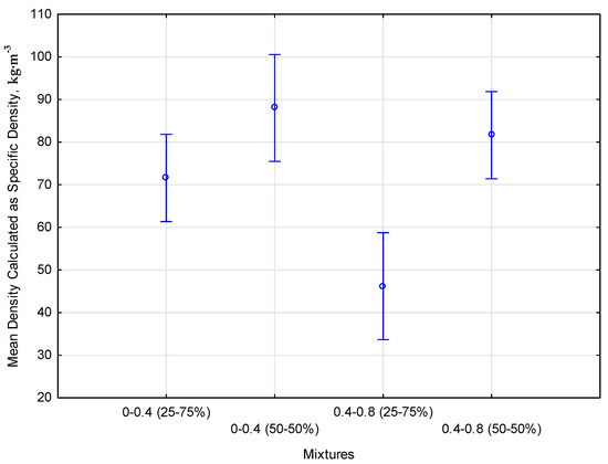 The compression tests of four mixtures, differentiated in terms of the composition of fractions 0 ÷ 0.4 and 0.4 ÷ 0.8 with ABS thermoplastic at 25% and 50% share, revealed a significant differentiation both in terms of the effectiveness of the compression process itself and the physical properties of the obtained materials. These results indicate significant differences in the behavior of materials depending on the ABS proportion, which may be important for their application in engineering and industrial practice. The total compression work, which measures the energy needed to compact the material, ranged from 1.234 × 10⁻8 J to 8.296 × 10⁻8 J, with the highest values recorded for mixtures with 50% ABS. The bulk density, indicating the degree of particle packing per unit volume before compression, was varied and ranged from 81.10 kg⋅m−3 for fraction 0.4 ÷ 0.8 with 25% ABS to 150.78 kg⋅m−3 for fraction 0 ÷ 0.4 with 50% ABS. As a result of the compression process, the density for all mixtures increased, maintaining a similar level of variability. The average density for the samples before compression was 119.75 kg⋅m−3. After compression, value increased to 132.89 kg⋅m−3, the largest increase in density was observed for the 0.4 ÷ 0.8 mixture with 50% ABS share. The specific density, taking into account both the solid material and internal and external pores, was lower than the bulk density, which indicates the porosity of the tested materials. The statistical relationship between the mean density calculated as specific density and the type of mixture is shown in Figure 9.