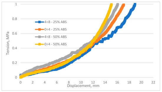 The biocomposite was manufactured by combining hemp shives with ABS regranulate to produce a product with the desired properties. In order to ensure the stability of the process and the quality of the final product, it was imperative to control the moisture level in the hemp shives. In a specially designed compacting attachment integrated with a heating module, hemp fractions 0 ÷ 0.4 mm and 0.4 ÷ 0.8 mm were thickened with a share of 25% or 50% of ABS additive. Using such a test rig allowed precise control of the process parameters and evaluation of the effectiveness of the compaction method. The thermoplastic was better bonded to the material fractions when the mixture was heated at 230 °C before compaction. The head of the compaction device moved at an equal speed of v = 5 mm⋅s−1, which caused the pressure to drop close to zero at the beginning of the experiment. Mechanical compression and the removal of accumulated air were achieved. The characteristics of the compaction process of the biocomposite with 25 and 50% ABS for the different fractions of hempseed were presented in Figure 12.