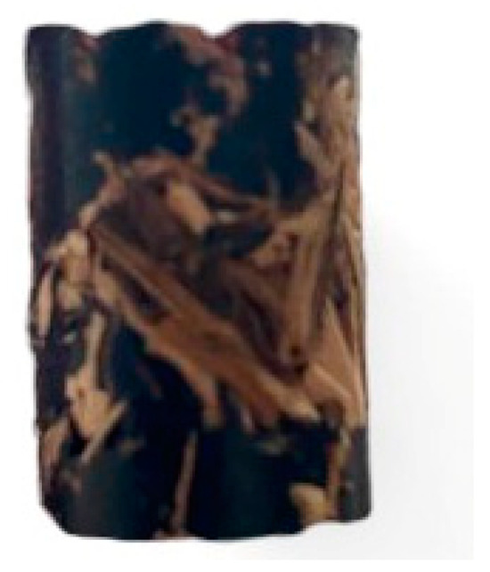 Compared to samples with half ABS content, samples with 25% ABS content exhibit higher stresses. The higher stress values indicate that ABS content increases the force required to compact the material. In addition to the size of the material fraction, the material compaction process is also affected by the size of the fraction. The highest stress is generated at the end of compaction in materials with 50% ABS and 0–4 mm fraction. As a result, a product containing 50% thermoplastic but with a larger fraction (4–8 mm) will generate more stress than a product containing 25% ABS with a fraction of 0–4 mm. Because the thermoplastic content in the biocomposite is higher, compacting it will be more difficult and require more force. The lowest stress is generated by a sample with 25% ABS and a fraction size of 4–8 mm due to its less thermoplastic content and larger fraction size. The graph shows that higher ABS content and smaller fraction size produce better material compaction. Biocomposite compaction is significantly influenced by ABS content in this case. The final strength of the produced material can be increased by increasing ABS content, and smaller material particles allow better dissolution of bands, resulting in greater densification of the composite. The product of the hemp compaction process with 50% ABS regranulate share and 0–4 mm of shive fraction was presented in Figure 13.