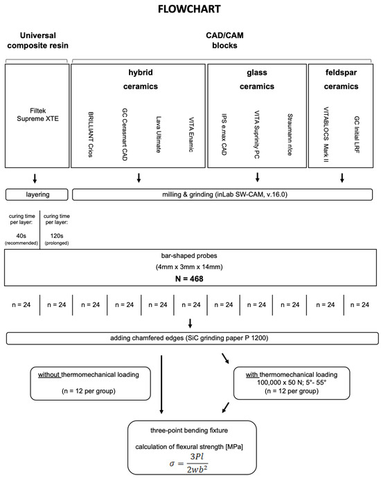 CAD/CAM materials (b-h) were also fabricated into a bar shape (3 × 4 × 14 mm3). First, specimens were designed digitally (inLab SW-CAM Software, v.16.0, Dentsply Sirona Inc., York, PA, USA). Then, milling and grinding were conducted according to the manufacturer’s instructions with a wet milling and grinding unit (inLab MC XL, Dentsply Sirona Inc., York, PA, USA) using burs (Step Bur 12S and Cylinder Pointed Bur 12S, Dentsply Sirona Inc.). Attachment points were smoothed with a polisher (SD 716F.150 HP, Jota Kit 1433, JOTA AG, Rüthi, Switzerland). A chamfer was added to every probe with a 1200-grit silicon carbide grinding paper (WS flex 18 C, Hermes Schleifmittel GmbH, Hamburg, Germany). The quality of the bars was then controlled under a digital microscope (Keyence VHX 200, Osaka, Japan) with a magnification of ×200 in order to identify the presence of defects, cracks, or other imperfections within the material. No specimens with macroscopic defects or anomalies were identified during this investigation.