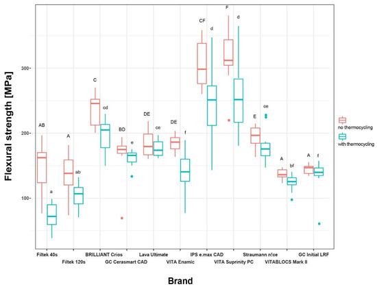 Boxplots representing the mean flexural strength values [MPa] for the materials tested. Same uppercase and lowercase letters indicate no significant difference for non-aged and aged groups, respectively.