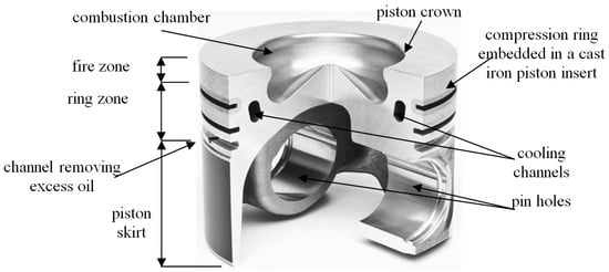 Due to the strengthening of the operating area of the piston ring zone and better heat dissipation, the (compression) ring is embedded in a cast iron insert (ring carrier). Until recently, pistons with a cast iron insert were used only in heavily loaded diesel engines, operating at a combustion pressure of 2.5 to 3.5 MPa, and in gasoline engines from 1.0 to 1.5 MPa [63]. Currently, due to increased engine power, increasing reliability during operation and meeting environmental emission standards, cast iron piston inserts (hereafter referred to as inserts) are used in all types of combustion engines. Ring inserts fulfil the following tasks (Figure 1):