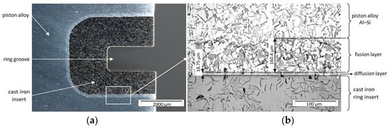 In order for the ring insert to adhere better to the piston, it is necessary to create a tight connection between the insert and the Al–Si piston alloy. Therefore, the inserts are subjected to the so-called “alfining”. This is a process that involves briefly immersing the insert in an alloy to create a diffusion layer [63,64,65]. An AlSi9 alloy was used for alfining the inserts. After cooling, the alfined inserts are placed in a die-casting machine, filled with a piston alloy and then subjected to machining and further stages of piston production.
