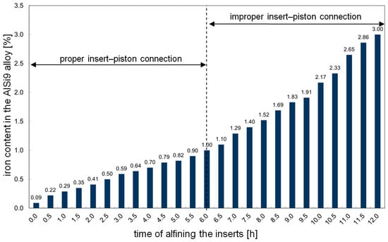 As the test results have shown, the alfining of piston ring inserts in the AlSi9 alloy causes a linear increase in the iron content (Figure 4). Using the alloy for up to approx. 6 h (1 wt.% Fe) does not cause any defects in the area of the insert–piston connection (due to the adopted criterion). After this time, as the iron content increases (caused by the diffusion of iron atoms into the AlSi9 alloy), the number of defective products also increases. An additional loss is the need to prematurely replace the AlSi9 alloy with a new one. The used alloy is treated as scrap and sold at a lower price compared to the feedstock, which generates financial losses. Thus, the alfining process of cast iron inserts is one of the main criteria determining the correct connection of cast iron ring inserts with piston castings made of Al–Si alloy. The percentage of casting defects on the contact surface of the insert with the piston indicates that the problem of proper connection between these elements is important from both process and technological points of view. Therefore, special attention should be paid to limiting and controlling the iron content in the AlSi9 alloy, especially after exceeding approximately 3 h of the alfining process. Research has shown that improper insert–piston connections are caused by two main reasons (accounting for almost 80% of all defects):
