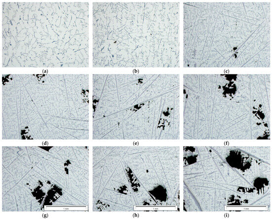 Images of microstructures of the AlSi9 alloy with the following iron contents: (a) 0.2, (b) 0.4, (c) 0.5, (d) 0.6, (e) 0.7, (f) 0.8, (g) 0.9, (h) 1.0 and (i) 1.2 (wt.%).