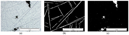 Microstructure of the AlSi9 alloy: (a) output image; (b) binary image of the β-Al5FeSi phase; (c) binary image of pores.