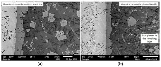 The aim of this study was to demonstrate the cause-and-effect relationship between the iron content and porosity in the area of the layer connecting cast iron with the Al–Si alloy. A practical example of this is the combination of a cast iron ring insert with the AlSi11Cu4Ni3Mg piston alloy. Therefore, this research was carried out to identify the most important defects in the insert–piston connection and then to identify the causes of their occurrence.