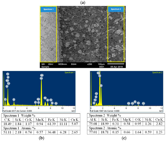 Based on the preliminary observation of the surface of the samples on which the chemical composition studies were carried out (Table 1, Table 2 and Table 3), EDS analysis and XRD, it was found that the structure of the samples was homogeneous on the surface. The results of testing the chemical composition of the cast iron from which the inserts were cast are presented in Table 1, those of the AlSi11Cu4Ni3Mg piston alloy in Table 2, and those of the AlSi9 alloy at the beginning of the alfining process in Table 3.