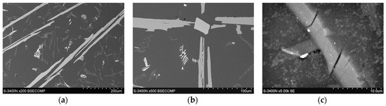 Regardless of the chemical composition of aluminium alloys and iron content, the β-Al5FeSi phase is morphologically the worst. Due to its low coherence with the matrix and large dimensions, it increases the brittleness of the alloy, makes the machining of castings more difficult and reduces tensile strength [19,20,21,22]. In addition, the lamellar morphology of the β-Fe phase (acicular on the surface of the metallographic specimen) impairs the castability, ductility and corrosion resistance of aluminium alloys.