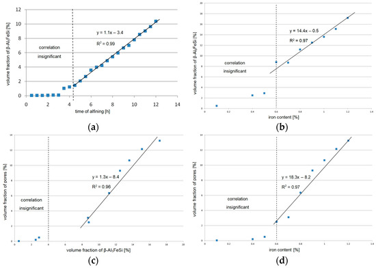 - Up to approx. 0.59 wt.% Fe, the volume fraction of the β-Al5FeSi phase and the volume fraction of shrinkage pores have low values—up to approx. 3%.