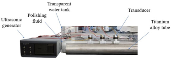The titanium alloy tube of TC4 (Ti6Al4V) was selected (outer diameter: 120 mm, wall thickness: 3 mm, and length: 600 mm). Before connecting to the tube, acoustic coupling gel (epoxy resin) was coated on the contact surface of the transducer to ensure that no air bubbles were retained between the transducer and the tube to maintain rigid contact. The transducer was placed in the tank together with the tube after the connection was completed. The polishing fluid was made from aluminum abrasive grains configured with deionized water at a concentration of 5 wt%. The polishing solution submerged the whole tube during the polishing process. The polishing solution should keep the solute particles in suspension during the experimental polishing process to achieve better polishing results. The control of the cavitation domain is achieved by a custom-made ultrasonic generator that excites the ultrasonic transducer with time delay signals of different phase differences. Under the excitation of the ultrasonic generator, the acoustic waves generated by the transducer will form a controlled pooled acoustic field in the inner wall region of the tube.