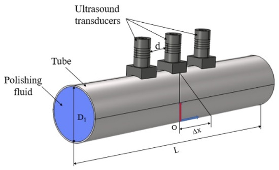 Three ultrasonic transducers were selected to simulate the movement of the polishing area with COMSOL Multiphysics 6.1. TC4 (Ti6Al4V) titanium alloy tube was chosen as the workpiece. The 3D model is shown in Figure 3, where d is the spacing between transducers, and ∆x is the deflection distance from coordinate origin O for the test point. The ultrasonic phase array tube model consists mainly of ultrasonic transducers placed on the outer surface of the titanium tube. The transducers and tubes used were matched to the dimensions and material properties of the experimental samples. The model ignored the contact between the epoxy resin and the cover plate. The coupling of the transducer contact surface with the tube surface was achieved by applying acoustic coupling gel between the transducer and tube contact surface. The specific physical fields used are ‘Pressure Acoustic Frequency Domain’, ‘Solid Mechanics’, ‘Electrostatics’, ‘Piezoelectric Effect’, and ‘Acoustic-structure boundary’.