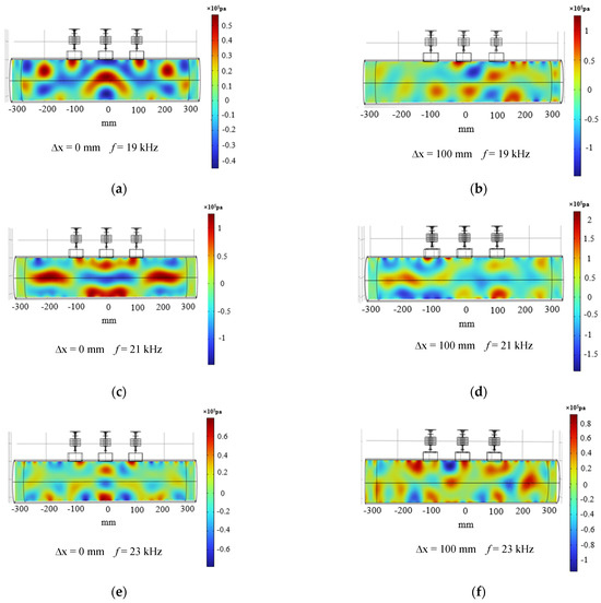 Since the trends of acoustic field changes caused by increasing frequency were similar, the acoustic pressure distribution diagrams with f = 19–23 kHz were selected here for comparative analysis. As shown in Figure 4, where the frequency of Figure 4a,b was 19 kHz, the frequency of Figure 4c,d was 21 kHz, and the frequency of Figure 4e,f was 23 kHz, the simulation results of the phase deflection distance ∆x = 0, 100 mm.