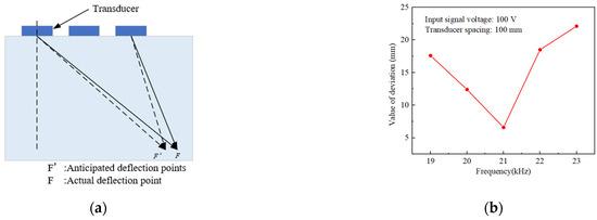 It could be observed from simulation Figure 4a–c that a good phase control effect was gradually revealed as the frequency increased, and the pooled acoustic pressure appeared at ∆x = 0 mm. At the same time, the size of the phase control region decreases with increasing frequency. When the phase control region was shifted to the right to ∆x = 100 mm, it could be seen from Figure 4b,d,f that there was a certain deflection of the acoustic pressure there. This was because the smaller the deflection angle, the better the directivity of the ultrasound beam and the higher the acoustic pressure energy. As the deflection angle increases, the phase control point moves away from the source and decreases the directivity [38]. Therefore, to explore the change of phase control deviation with frequency when ∆x = 100 mm, Figure 5a principle of phase control deviation and Figure 5b change rule are obtained. From Figure 5b, it could be seen that only the value of deviation shows the change rule of decreasing and then increasing, and it has a more accurate phase control at 21 kHz, and the value of deviation is only 6.2 mm. Obviously, only the ideal state of phase array polishing to reach the precise effect, resulting in this deviation is often the acoustic pressure energy through the different media attenuation of the impact. Therefore, it is more in line with the expectation of the phase array effect to minimize the effect at 21 kHz.