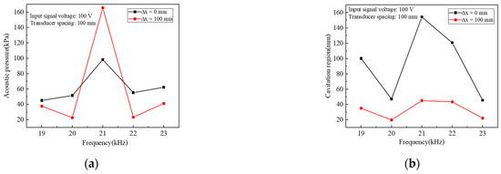 For comparison, statistics on the magnitude of the inner-wall phased acoustic pressure amplitude and the size of the cavitation domain range at five frequencies were carried out. Figure 6 shows the trend of acoustic pressure amplitude and range with frequency at two deflection distances for five different frequencies. From Figure 6a, it could be seen that at a phase array deflection distance of 0 mm, the amplitude of the acoustic pressure increased and then decreased as the frequency increased, and the amplitude of the acoustic pressure had a high gain at a frequency of 21 kHz. When the frequency was increased from 19 kHz to 21 kHz, the acoustic pressure increased by 164.2%, which was obviously changed. This was mainly because the resonant frequency of the designed transducer was near 21 kHz, where the transducer conversion efficiency is significantly increased compared to other frequency states, so there will be a larger acoustic pressure gain at 21 kHz. Therefore, in the actual machining process, it is necessary to ensure that the frequency is under the resonance frequency of the transducer to improve the effect of workpiece material removal [39]. When the phase array deflection distance was 100 mm, the same maximum acoustic pressure amplitude was found at 21 kHz with 339.5% gain compared to the lowest amplitude at other frequencies. Figure 6b shows that only at 21 kHz was the polishing area the largest, and at two different deflection distances, the area sums up to 196.3 mm. Therefore, in the actual transducer design, it is necessary to track its resonant frequency; at the transducer resonant frequency, transducer amplitude is large, and the vibration with the distance of the decay is slow. This facilitates the expansion of the cavitation domain and maximizes the acoustic pressure gain.