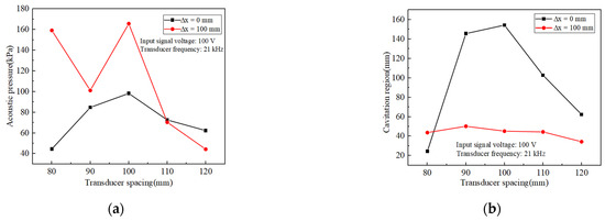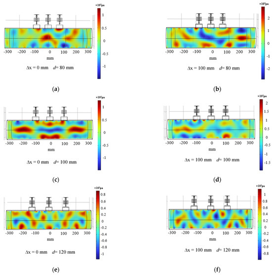 Similarly, the acoustic pressure distribution plots with spacing of d = 80, 100, and 120 mm were selected here for comparative analysis. As shown in Figure 7, where the spacing was 80 mm in Figure 7a,b, 100 mm in Figure 7c,d, and 120 mm in Figure 7e,f, under conditions of ∆x = 0, 100 mm.