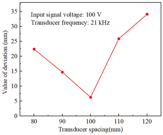 An excellent gradual effect could be formed at the position where ∆x = 0 mm as the spacing of the transducer array increased in Figure 7a. When the control point moves to ∆x = 100 mm on the inner wall of the tube, the phase array deflection point fails to achieve good pooled acoustic pressure and has a certain deviation at the spacing of 80 mm, 100 mm, and 120 mm in Figure 7b,d,e. The reason for this phenomenon was due to the increase in deflection angle, which leads to a decrease in the directionality of the acoustic beam, as described in Section 3.1. Similarly, it could be seen that the deflection value is still the smallest at ∆x = 100 mm, compared with the phase array deflection values at a deviation distance ∆x = 100 mm under different spacing in Figure 8.