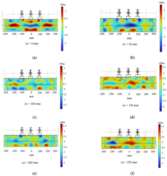 Distribution of acoustic pressure at different deflection distances in the inner wall of the tube with optimum parameters. (a) phase control deflection distance ∆x = 0 mm, (b) phase control deflection distance ∆x = 50 mm, (c) phase control deflection distance ∆x = 100 mm, (d) phase control deflection distance ∆x = 150 mm, (e) phase control deflection distance ∆x = 200 mm, (f) phase control deflection distance ∆x = 250 mm.