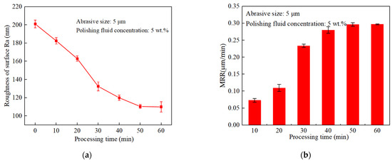 The abrasive slurry was a mixture of alumina, abrasive, and deionized water. The particle size of the alumina abrasive was 5 μm and the mass concentration was 5%. The ultrasonic system was used to polish the TC4 (Ti6Al4V) alloy samples from 0 to 60 min, and the material surface roughness and material removal rate (MRR) varied with the processing time as shown in Figure 13. Based on the experimental results, it can be seen that the surface roughness of the workpiece decreases the fastest when the processing time was from 0 min to 30 min, and the decrease in roughness from 30 min to 60 min slows down and tends to be stable. Similar to the roughness, the material removal rate has the largest rate of change from 0 to 30 min, and after 30 min, it also decreases gradually with an increase in machining time and tends to be stable. In the end, the overall roughness was improved to less than 0.2 μm by the surface requirement of the precision tube, and the roughness was reduced by 46.5% after 60 min of polishing.