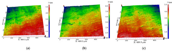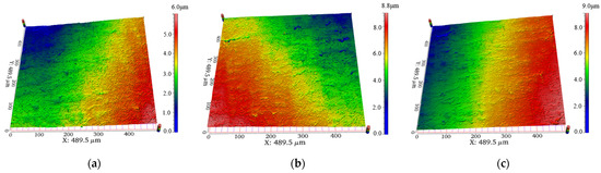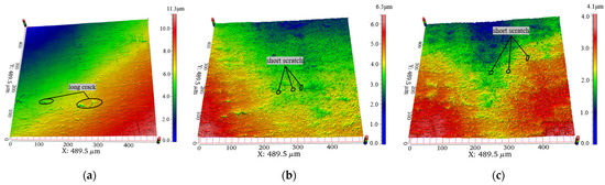 Figure 16 shows the surface morphology after machining at several deflection distances for a constant voltage input. The machined morphology at the three different deflection distances shows a similar morphology to that of Figure 14, with a large number of short and shallow scratches as the main morphological feature. However, comparing the three kinds of morphology, it can be seen that the number of shallow and short scratches in Figure 16a was slightly higher than that in Figure 16b and higher than that in Figure 16c, and the morphology change rule at this point also confirms the change rule of the roughness difference and MRR at different phase control deflection distances.