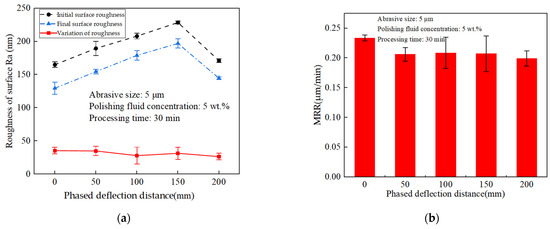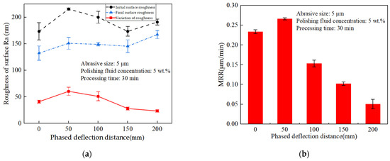 However, this effect for the actual tube polishing could not achieve a uniform smooth effect; different phase control distances require the application of voltage control to maintain uniform polishing. By the voltage input law in Table 2, the different phase control deflection distances of 0, 50, 100, 150, and 200 mm were processed, to observe the different phase control deflection distance polishing before and after the change rule of the roughness difference and the influence of the MRR; the results are shown in Figure 17. From Figure 17a, it can be seen that the roughness variation amount remains approximately the same at each phased deflection distance under the control of voltage input. In addition, the MRR variation rates in Figure 17b were all around 0.2 μm/min, which indicates that this voltage control could achieve the overall uniform polishing of the inner wall of the phased channel and confirms the simulation results.