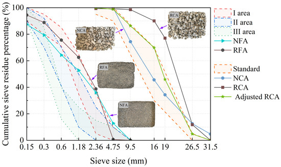 The natural coarse aggregate (NCA) used in this paper is gravel, and the NFA is river sand. The recycled aggregates were sourced from a highway reconstruction and expansion project in the Xinjiang Uygur Autonomous Region. The physical properties of the coarse and fine aggregates were determined according to the relevant standards [39,40,41,42]. The results are shown in Table 2 and Table 3, respectively. As shown in Figure 2, the original size distribution of the RCA does not meet the requirements [42], since the coarse aggregate used in the road engineering exhibited a gap-graded distribution. Therefore, the RCA was manually re-sieved to adjust it to a continuous particle size distribution that complied with the requirements.