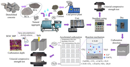 The accelerated carbonation test was conducted using a CCB-70F carbonation test chamber, following the relevant requirements [45]. The compressive strength test was performed using an HCT306A microcomputer-controlled electro-hydraulic servo pressure testing machine produced by Wance Test Equipment Co., Ltd. (Shenzhen, China), according to the relevant requirements [46]. Specimens for the accelerated carbonation test were removed from the curing room after 26 days, dried for 48 h, and then had four of their surfaces sealed with paraffin, leaving two opposite faces exposed. These specimens were then placed in the carbonation test chamber for the accelerated carbonation test. The specific test procedures are shown in Figure 3.
