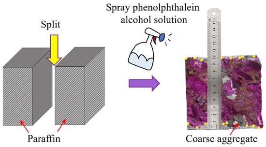 As shown in Figure 4, after spraying the phenolphthalein solution for 30 s, a measurement point was taken at every 10 mm and the carbonation depth was measured at each point with a steel ruler. When the carbonation boundary at the measurement point coincided with a coarse aggregate particle, the arithmetic mean of the carbonation depths on both sides of the particle were taken as the carbonation depth value at that point. Finally, the arithmetic mean of the carbonation depths at all measurement points were taken as the carbonation depth of the specimen. The carbonation depths of each group of FARAC specimens were measured after 3, 7, 14, and 28 days of carbonation, and are displayed in Figure 5.