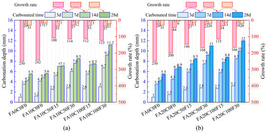 Carbonation depth and growth rate of the specimens: (a) FA content = 10%; (b) FA content = 20%.
