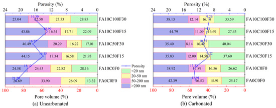 A reasonable pore size distribution can improve the mechanical properties and durability of concrete. According to previous studies, the internal pores of concrete are categorized into the following four types: <20 nm (harmless pores), 20–50 nm (less harmful pores), 50–200 nm (harmful pores), and >200 nm (more harmful pores) [36,56]. To explore the effect of accelerated carbonation on the pore structure of the FARAC, six groups of uncarbonated and carbonated samples were selected for the MIP tests. The pore size percentage distributions and porosity of the uncarbonated and carbonated specimens are shown in Figure 7.