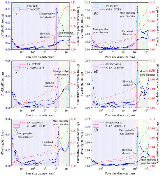 Incremental and cumulative pore volume curves of uncarbonated (group name) and carbonated (C-group name) FARAC under a 10% FA content. (a) FA0C0F0; (b) FA10C0F0; (c) FA10C50F15; (d) FA10C50F30; (e) FA0C100F15; (f) FA10C100F30.