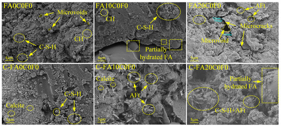 Since the use of recycled aggregates does not change the types of hydration products, three mix proportions of uncarbonated and carbonated specimens without recycled aggregates were selected for the SEM-EDS tests to highlight the improvement of the microstructure due to carbonation. The results are shown in Figure 9 and Figure 10. For the uncarbonated specimens, a comparison of the microstructures of FA0C0F0, FA10C0F0, and FA20C0F0 reveals that the addition of FA can improve the internal structure of the concrete. From the micrographs of FA10C0F0 and FA20C0F0, partially hydrated FA particles can be observed, indicating that FA requires a longer curing time for complete hydration, which is same as the conclusions of Nazeer et al. [63]. Comparing the micrographs of the uncarbonated and carbonated specimens in Figure 9, it is found that the quantities of calcite and ettringite increase after accelerated carbonation, making the concrete matrix denser. As depicted in Figure 10, the SEM-EDS test results reveal a notable increase in the hydration products of FA10C0F0 and FA20C0F0 after accelerated carbonation. It is observable that AFt was intertwined with C-S-H gel, which is conducive to the strength enhancement of the FARAC. This further substantiates the promotion role of FA in the hydration process. As shown in the reaction mechanism in Figure 3, during the accelerated carbonation process, CO2 enters the concrete through the pores and reacts with the hydration product to form calcite crystals of CaCO3. After that, CaCO3 penetrates into the microvoids and microcracks along with moisture, playing a role in pore filling [30].