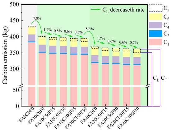 As shown in Table 8, the LCA carbon emissions of the FARAC with different mix proportions decrease with the increase in the FA content and the replacement rate of the recycled aggregate. Compared with FA0C0F0, the CL of FA10C0F0 and FA20C0F0 decreased by 7.8% and 15.46%, respectively. It can also be seen that the largest proportion of CT comes from C1a and C1b. This is consistent with the research results of Xia and Xiao et al. [71,72]. The production of OPC generates a large amount of carbon emissions, and the use of supplementary cementitious materials such as FA and slag to partially replace OPC can reduce the carbon emissions from raw material production, thereby effectively reducing the carbon emissions of concrete [11].