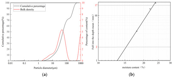 The silt soil was sourced from Harbin, Heilongjiang Province. The soil collected from the field was air-dried naturally, ground into a powder, and sifted through a 2 mm standard sieve, as shown in Figure 1a. According to the “Highway Test Geotechnical Code”, the fundamental physical properties of the soil, including natural moisture content, maximum dry density, and optimal moisture content, were determined (see Table 1). The particle size distribution curve is presented in Figure 2a, and the liquid limit curve is depicted in Figure 2b.