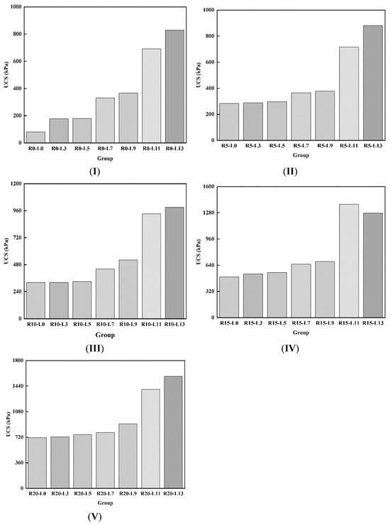 Compressive strength of soil samples with different addition amounts of rice husk carbon and lignin ((I)—R0, (II)—R5, (III)—R10, (IV)—R15, (V)—R20).