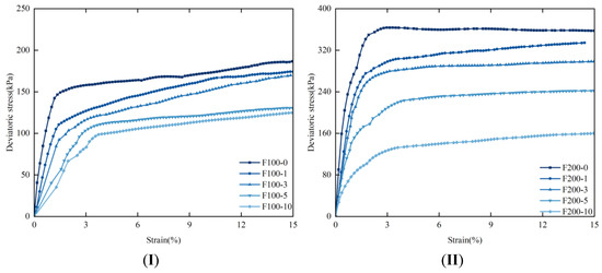 Due to the internal heterogeneity and anisotropy of rice husk carbon–lignin solidified silt soil, the stress–strain curve exhibits significant variability under different confining pressures and various freeze–thaw cycles. The overall transformation can be categorized into the following stages: the elastic stage, the yield stage, and the subsequent strain hardening or strain softening stage. As shown in Figure 4, the stress–strain curves of the specimens under varying confining pressures indicate that, with consistent confining pressure, the peak deviatoric stress gradually increases with the number of freeze–thaw cycles. When the axial strain ranges from 0 to 2.5%, the stress–strain curve rises sharply. At 2.5% axial strain, the peak deviatoric stress stabilizes, as the bonded particles reach their maximum load-bearing capacity. As the number of freeze–thaw cycles and confining pressure increase, the soil undergoes external compression, resulting in a reduction in internal bonding. Consequently, the silt soil’s resistance to external loads progressively diminishes. Interaction and friction between the soil particles contribute to strain hardening, initially strengthening the soil, but ultimately leading to a decline in bearing capacity due to internal damage. These findings underscore the importance of considering freeze–thaw cycles and confining pressure in soil stabilization. While the initial increase in strength is advantageous, the long-term stability of treated soil must be carefully monitored.