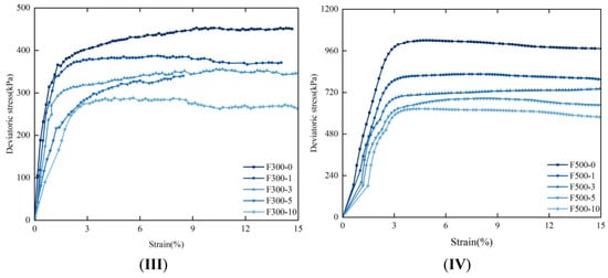 Stress–strain curves of samples under different confining pressures (I)—CP = 100 kPa, (II)—CP = 200 kPa, (III)—CP = 300 kPa, (IV)—CP = 500 kPa.