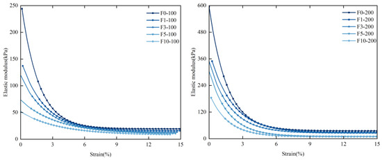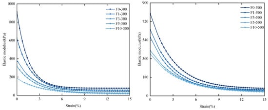 The elastic modulus is a critical parameter that characterizes the mechanical properties of rock and soil. Figure 5 illustrates the elastic modulus of soil samples subjected to consistent confining pressure across various freeze–thaw cycles. The trend in the elastic modulus after multiple freeze–thaw cycles closely mirrors that of unfrozen soil samples. The study reveals an inverse correlation between the elastic modulus and the number of freeze–thaw cycles. As the number of freeze–thaw cycles increases, the elastic modulus consistently decreases, with the rate of decline gradually tapering off. Additionally, as the shear stress rises, the elastic modulus continues to decrease until it stabilizes at a certain threshold. This reduction is attributed to the freeze–thaw cycles disrupting the colloidal particles in the soil and curing agent, resulting in a looser soil structure and diminished strength.